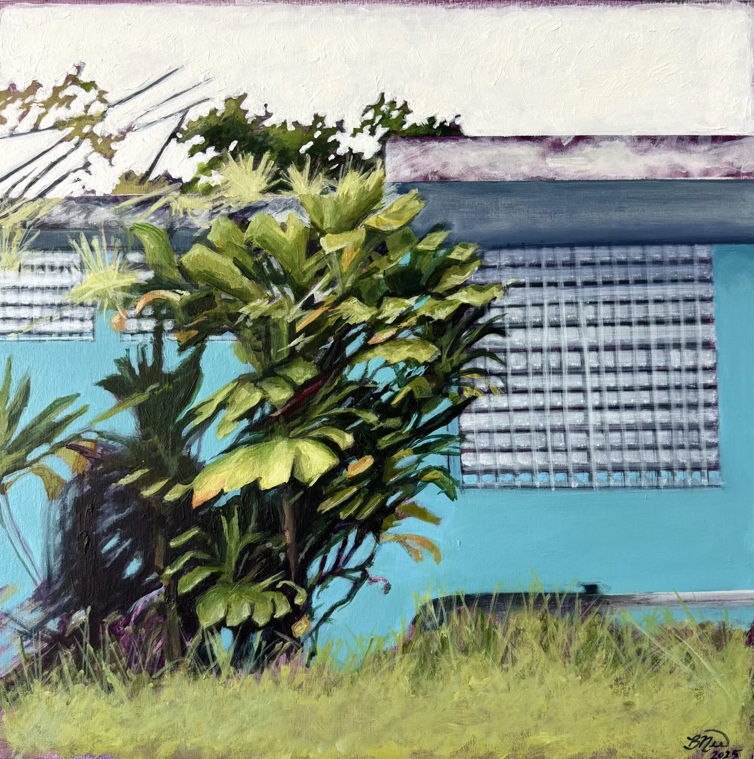 This painting shows a house in Guaynabo, Puerto Rico, where the artist’s grandmother once lived. It was also the first place her mother brought her as a newborn. The image is based on a photo the artist took during a recent visit to the island. She has seen the house many times throughout her life. It sits across from her titi’s home, where the family still gathers.
